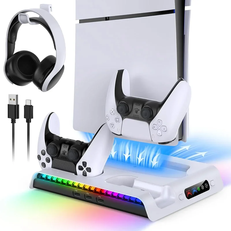 پایه فن عمودی iPega RGB مخصوص PS5 Slim طراحی شده و یک محصول چندمنظوره کاربردی برای گیمرهاست. این استند دارای فن خنککننده قوی برای جلوگیری از داغ شدن کنسول، داک شارژ برای دو دسته DualSense و نورپردازی RGB جذاب است که جلوهای مدرن به ستاپ گیمینگ شما میدهد. علاوه بر این، قابلیت نگهداری دیسکهای بازی و مدیریت کابلها باعث شده که این پایه یک ابزار کامل برای تنظیم و محافظت از PS5 Slim باشد.